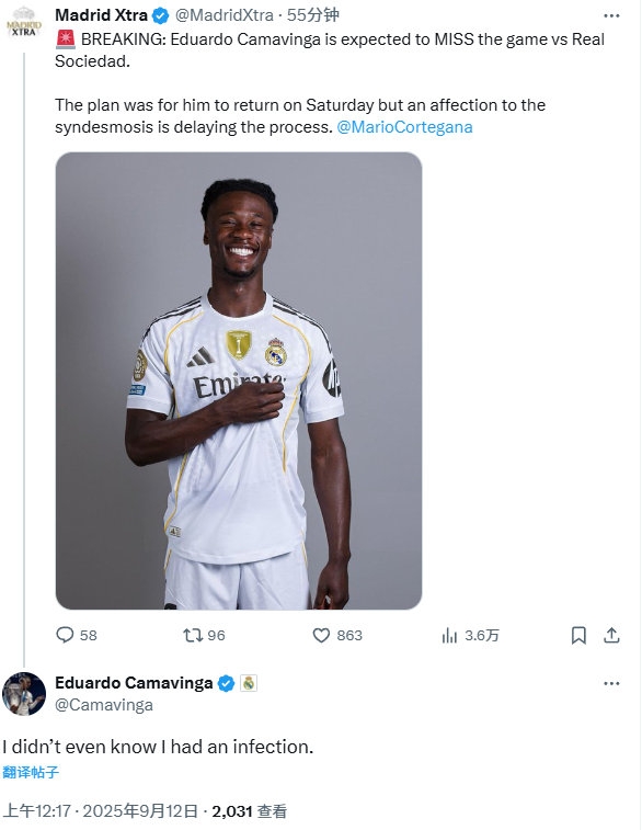 文章目录 [+] 09月12日讯 此前据The Athletic记者Mario Cortegana报道,皇马中场卡马文加预计将缺席客场对阵皇家社会的西甲联赛。卡马文加随后在该条新闻下回复:“我咋不知道自己受伤了。”