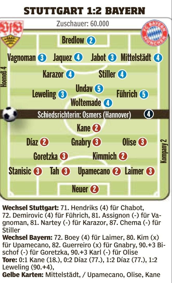 北京时间8月17日,拜仁慕尼黑依靠哈里-凯恩和路易斯-迪亚斯的进球在德国超级杯决赛中2-1击败了斯图加特,赛后《图片报》对两队球员的表现进行了评分。